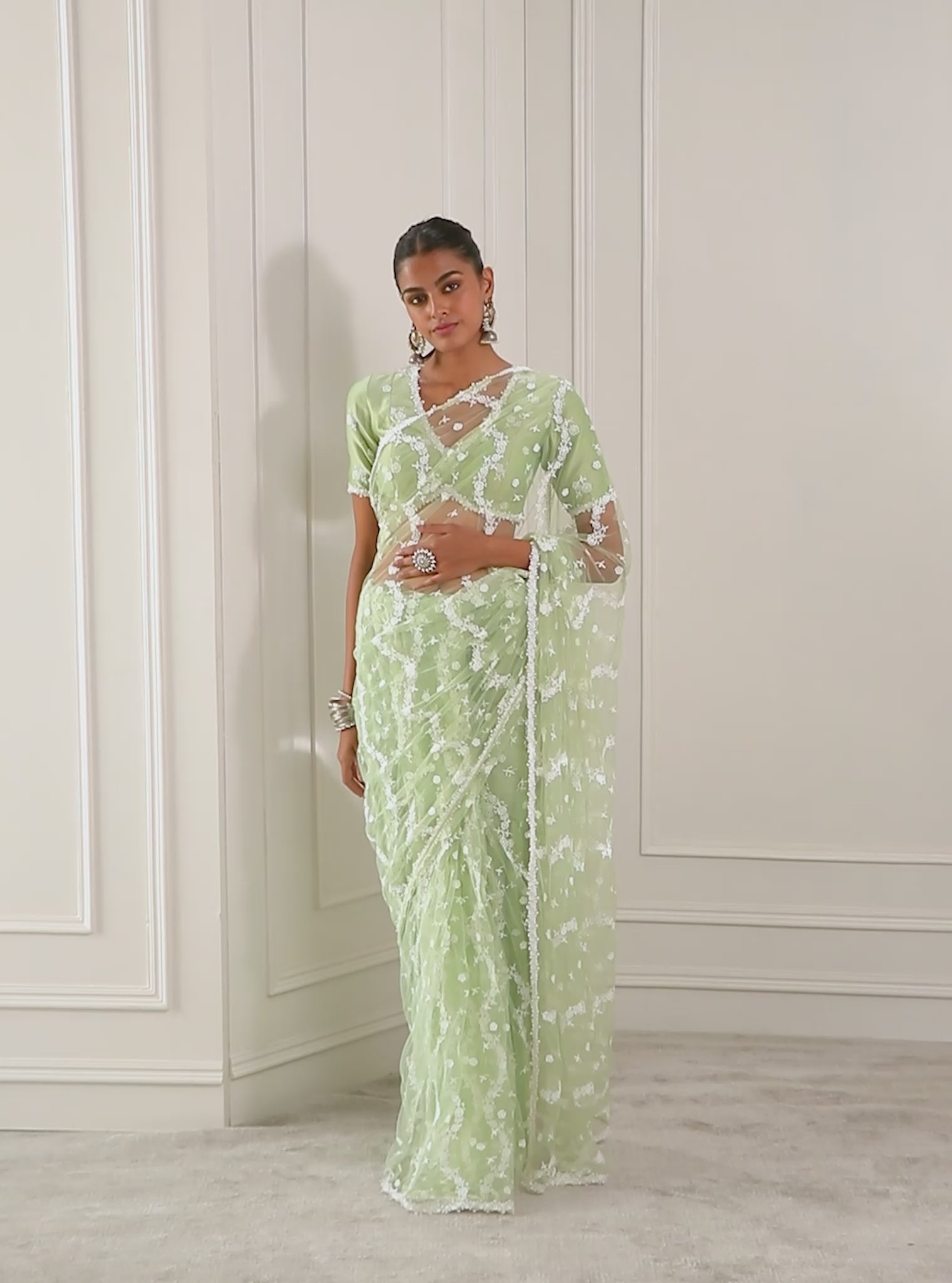 The Dainty Net Saree Is Designed For Summer Weddings In The Most Refreshing Shades With A Unique Combination Of Running Embroidery And Delicate Motifs, Finished With A Unique Floral Lace Trim Border.