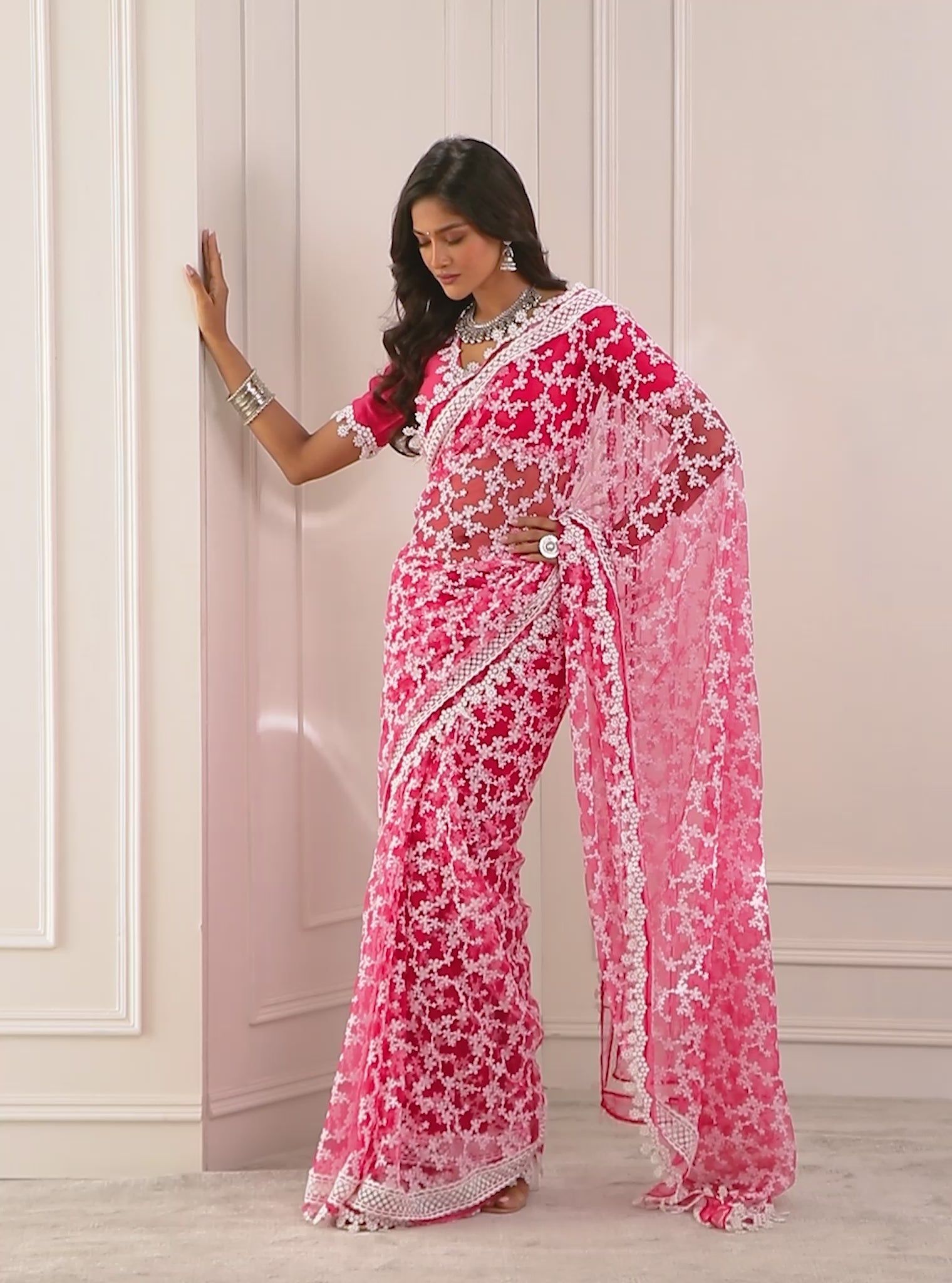 The Peora Net Saree In The Shade Of Spring Is Made For The Festivities With Cute Floral Embroidery Running Across The Body. The Bright Red Saree Is Finished With A Rich Double Lace Border Brought To The Perfect Balance Owing To The Fall Of The Fabric.