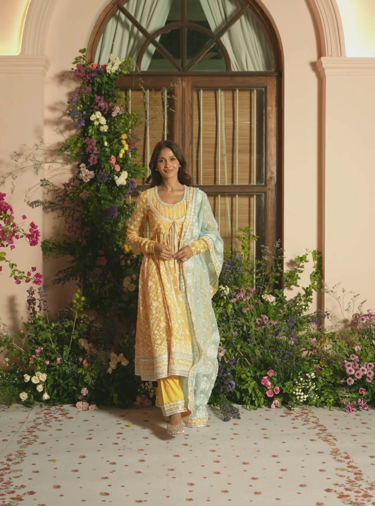Flared organza Anarkali with defined panel construction for volume without bulk. Paired with smooth Pima satin pants for comfort and contrast sheen. Lightweight and breathable despite its festive structure. Suitable for wedding functions and evening events.