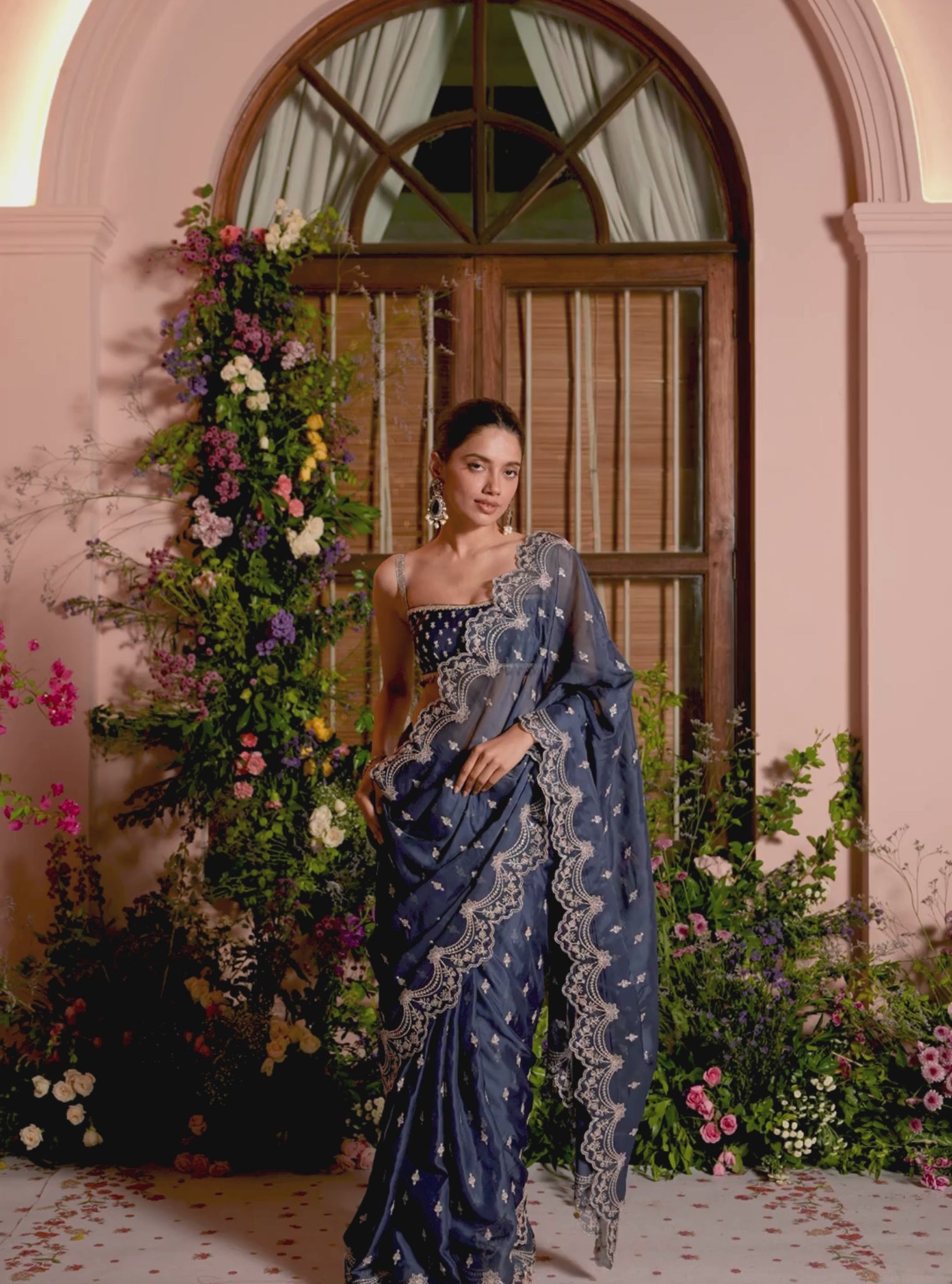 A timeless festive essential crafted in sheer Organza with a soft, fluid drape. This exquisite Navy saree is detailed with fine embroidery that adds texture while keeping the look clean and contemporary. Finished with a Pima Satin blouse that offers structure and comfort.