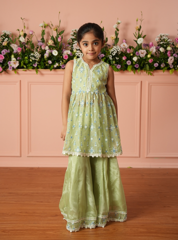 Charming and light as a breeze, the Averine Kurta Set is crafted in sheer organza with soft cotton lining for all-day comfort. The dusty pink kurta features delicate yellow floral embroidery, finished with dainty lace at the neckline and hem. The sleeveless Anarkali silhouette pairs beautifully with matching organza sharara pants, detailed with embroidered borders. A sweet, festive set made for twirls and smiles.