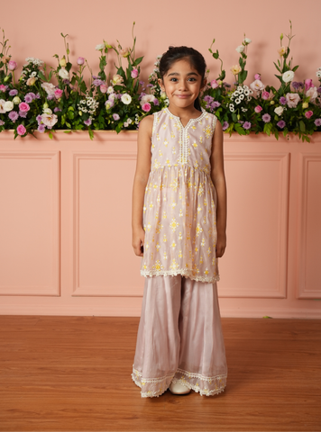 Fresh and festive, the Averine Kurta Set in green is a lovely pick for celebrations. The organza kurta features delicate yellow floral embroidery over a soft green base, with lace trims highlighting the neckline and hem. Designed in a sleeveless Anarkali silhouette, it pairs with matching organza sharara pants, finished with coordinated embroidery. Light, graceful, and full of charm- just right for special occasions.