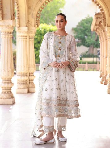 It’s paired with matching cotton pants detailed with embroidery at the hem, adding quiet sophistication. The look is tied together with a pink organza dupatta; airy, embroidered, and edged with lace that sways with every step.