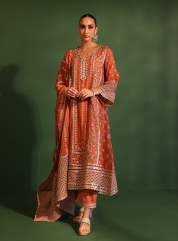 The complementing dupatta is beautifully bordered and patterned to echo the intricate details of the Anarkali. It is an ideal choice for evening celebrations, festive gatherings, or wedding ceremonies.