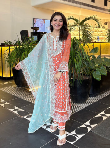 The highlight of this ensemble is the serene blue dupatta, intricately embroidered with dainty floral patterns and framed with scalloped lace borders.