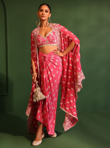 Draped In The Elegance Of Midnight, This Black Embroidered Skirt Set Is A Symphony Of Grace And Grandeur. Crafted In Luxurious, Lightweight Fabrics, The Ensemble Features A Beautifully Embroidered Pre-Draped Skirt That Flows Effortlessly, Cinched At The Waist With Artful Gathers Creating A Flattering Silhouette. Delicate Floral Motifs Cascade Across The Fabric. The Highlight Of This Set Is The Sheer, Floor-Length Cape—An Embodiment Of Regal Sophistication. Trimmed With Intricate Embroidered Borders, It Drapes Gracefully Over The Shoulders, Creating An Alluring Play Of Sheer And Opaque Textures.