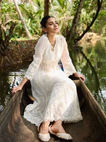 Blushing In Soft Romance, This Beige Anarkali Kurta Set Is A Poetic Blend Of Elegance And Grace. Crafted In Airy, Breathable Organza, The Kurta Features Intricate White Embroidery Delicately Spread Across The Bodice, Sleeves, And Hemline, Creating A Dreamy, Ethereal Charm. The Yoke Is Adorned With Fine Lace Trims And A Tassel Tie-Up. Paired With Embroidered Straight-Leg Pants That Feature Dainty Lace Edging, This Set Is Perfect For The Moments Of Romanticising Summer.