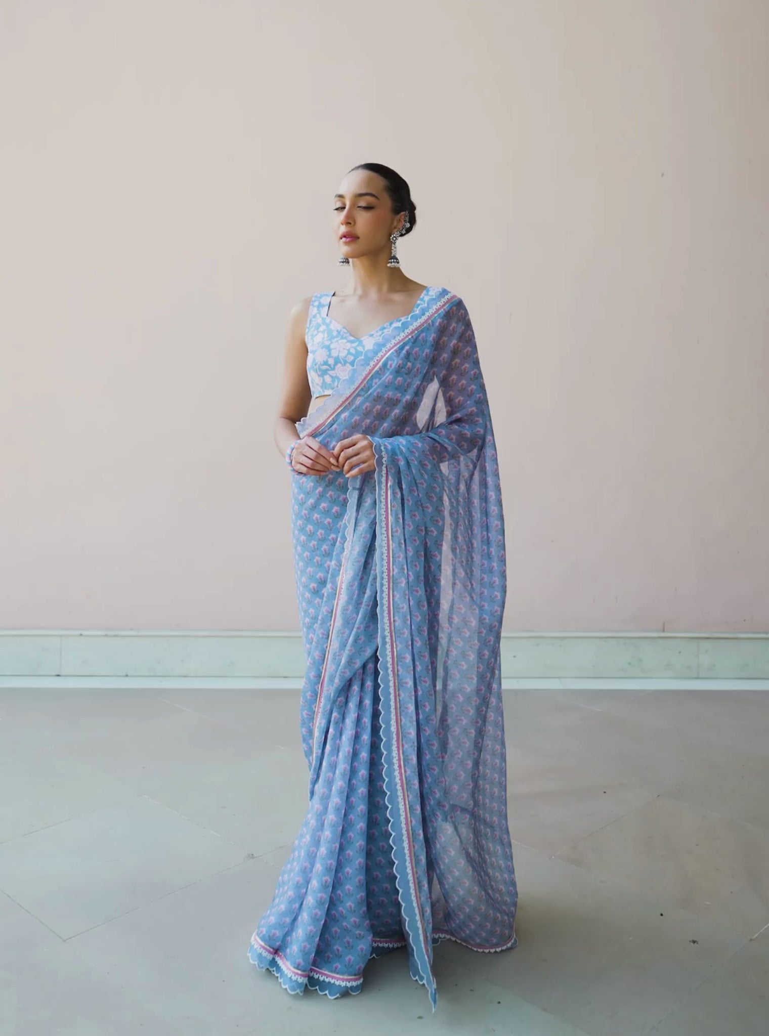 The Clarimond Saree In Blue Is Crafted In Sheer Organza With Dainty All-Over Booti Prints. It’S Finished With A Contrast Piping And A Delicate Scalloped Border, Accented With Lumpy Gota For A Touch Of Glint. The Saree Is Paired With An Unstitched Blouse Piece Featuring A Bold Gadh-Inspired Print.