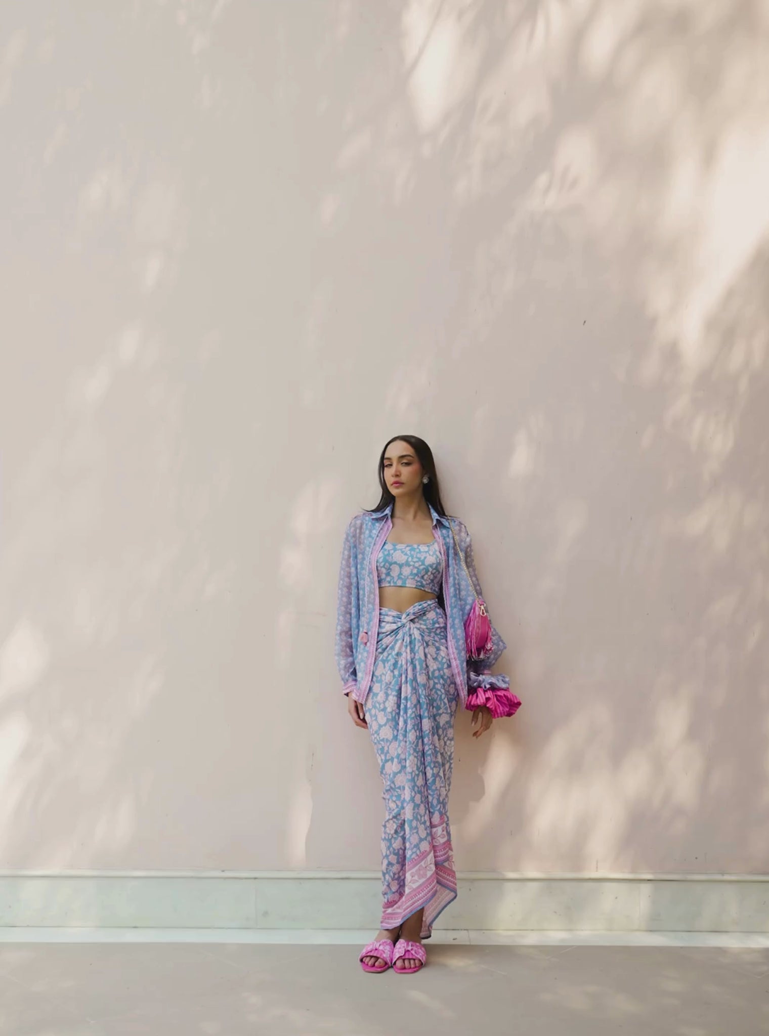 The Nazeera Shirt Set In Steel Blue Is A Striking Three-Piece Look That Blends Structure With Softness. It Features A Draped Tie-Up Skirt In Printed Lawn With Contrast Borders And Gadh Motifs, Styled With A Matching Bustier. The Sheer Organza Shirt Is Designed With All-Over Booti Prints, Balloon Sleeves, And A Cut-Daana And Bead Hand-Embellished Trim. A Braided Dori Tassel At The Collar Adds An Artisanal Touch.