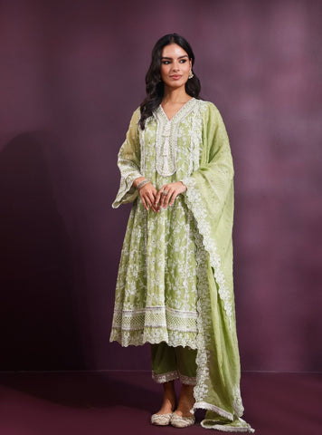 The Rupa Anarkali Set in Off White radiates timeless grace. The organza kurta features fine embroidery and lace detailing that highlight its flared silhouette. Worn with Pima Satin Pants and a matching Organza Dupatta, it's the perfect pick for serene festivities and elegant day celebrations.