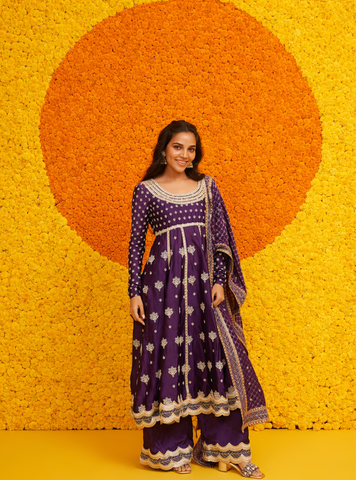This vibrant kurta set captures the essence of festive elegance. The deep purple kurta is lavishly adorned with intricate zari embroidery - the striking contrast adds to its luxurious appeal. The flowing anarkali silhouette with a defined waistline flatters the figure, making it perfect for twirling on the dance floor. The matching palazzo pants mirror scalloped hem and are embellished with detailed embroidery. Completing the ensemble is a dupatta with a stunning gold border, echoing the kurta's embroidery and enhancing the outfit's overall opulence.