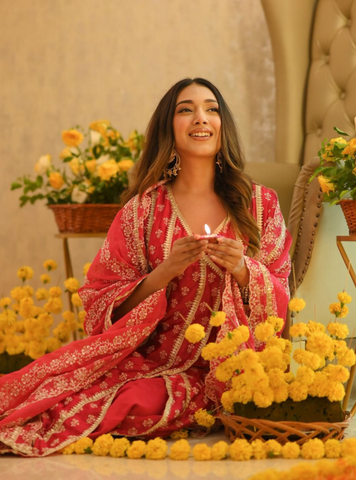 This striking kurta set is an impeccable choice for shaadi celebrations, blending traditional aesthetics with festive flair. The deep fuschia kurta is richly embellished with intricate white embroidery, exuding a royal and timeless appeal. The V-neckline and flowy silhouette offer both comfort and elegance, perfect for a variety of wedding events. The matching pants feature delicate embroidery along the cuff adding to the outfit's sophistication. The dupatta, with its ornate border and matching embroidery, elevates the entire look, making it a statement piece for any wedding function.