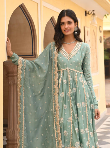The quintessential Anarkali, meticulously crafted for unforgettable wedding celebrations. Tailored for the traditional soul within you, this ensemble is an absolute must-have in your celebratory wardrobe. The mesmerizing teal hue adds a distinctive charm to the attire.