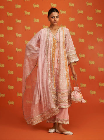 Crafted in the softest shades of blue, the kurta features intricate embroidery in a delicate white and gold palette, creating a harmonious contrast that enhances the ethereal charm of this ensemble. The angrakha-inspired kurta silhouette has a classic charm. The full-length sleeves are beautifully accented with embroidered borders and gotta trim. The scalloped hemline, bordered by gotta detailing, adds a layer of opulence, making this outfit an ideal choice for festive occasions.