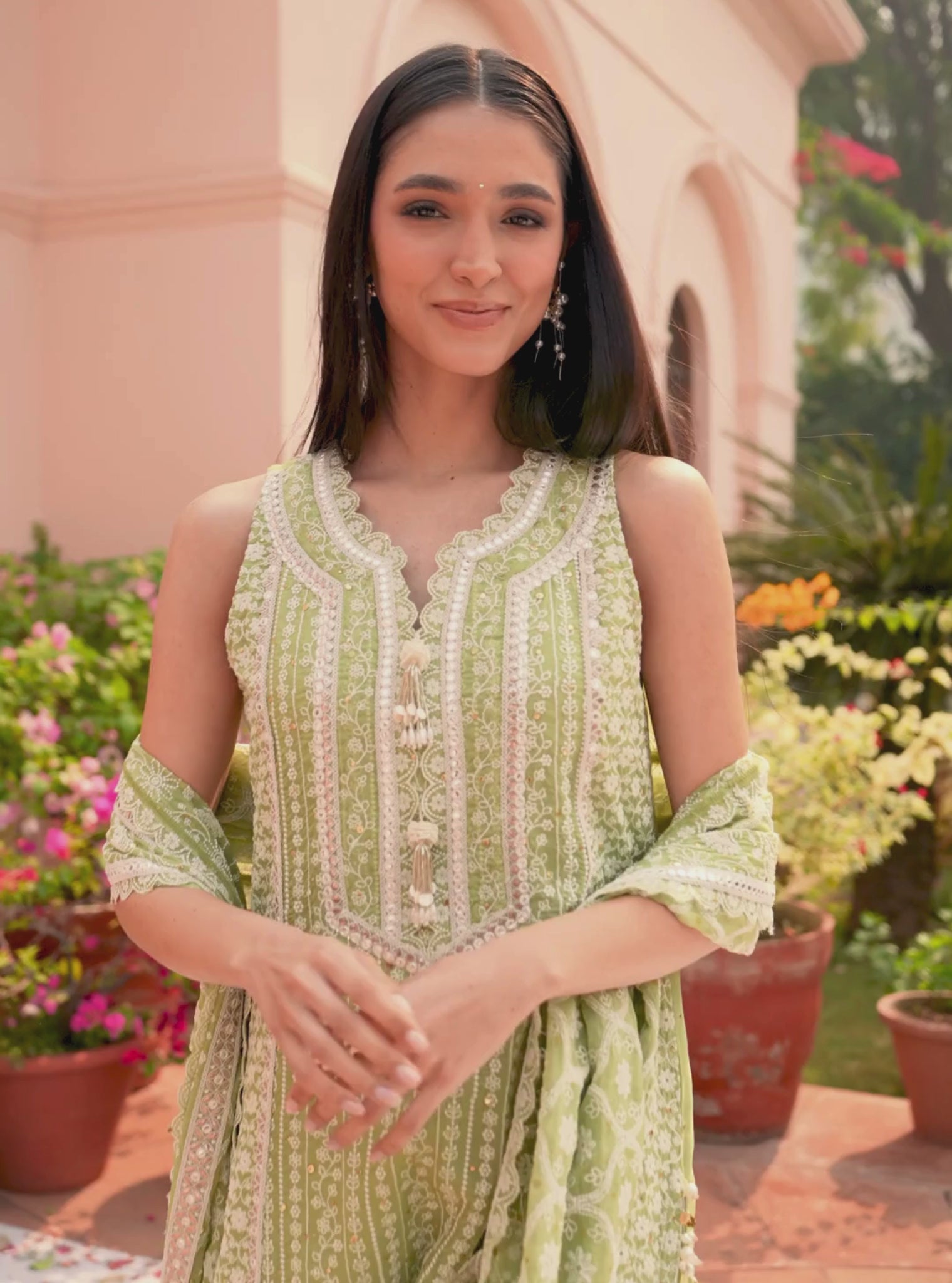An ethereal organza kurta paired with smooth pima satin pants, finished with intricate detailing throughout. Light yet structured, this green set works beautifully for mehendi mornings, festive lunches, and wedding celebrations.