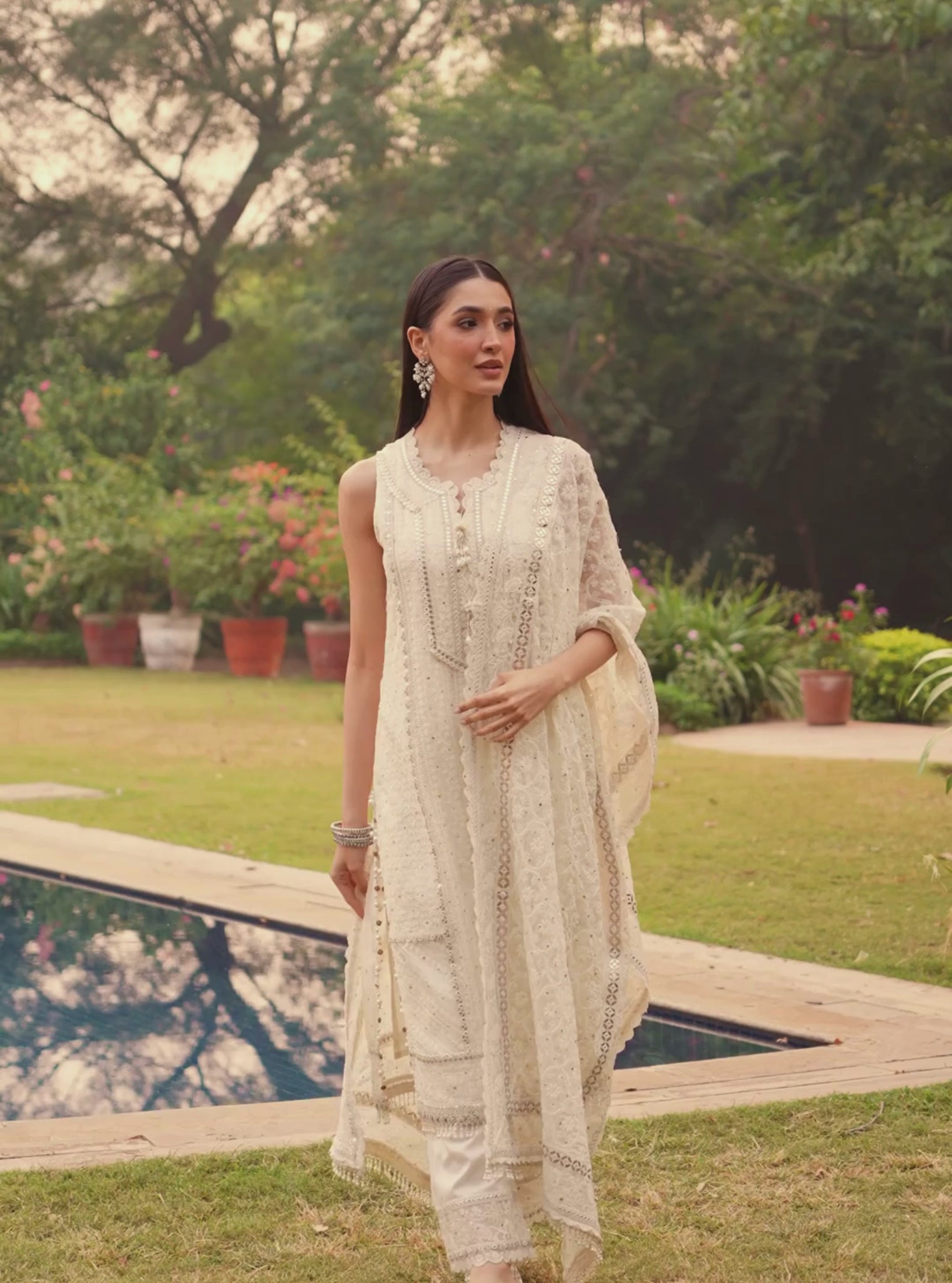 Designed in sheer organza with soft pima satin pants, this off-white kurta set feels timeless and refined. Elegant without being heavy, it’s perfect for intimate functions, daytime festivities, and moments that call for quiet celebration.