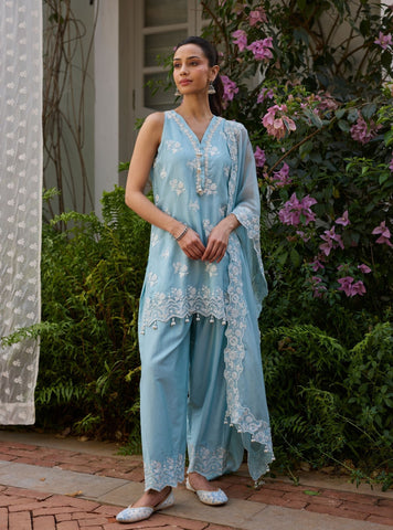 The Tiki Kurta Set is crafted in sheer organza and designed in a straight silhouette for a relaxed yet polished fit. The kurta features delicate detailing and is paired with comfortable satin salwar pants that add balance and movement. The coordinated organza dupatta completes the ensemble.