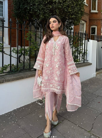 Drape yourself in effortless elegance with this stunning black embroidered kurta set, a perfect blend of modern sophistication and timeless grace. Crafted from sheer organza, the kurta features intricate tonal embroidery, lending it a rich, textural appeal. The delicate lace trims along the V-neckline, sleeves, and hemline add an element of feminine charm, while the asymmetrical cut enhances the fluidity of the silhouette.