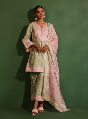 Vibrant and full of festive charm, this rust-hued kurta set is a masterpiece of traditional elegance. Adorned with delicate embroidery, the straight-cut kurta features intricate floral motifs all over. The embroidered yoke, framed with a finely detailed border, enhances the neckline, while the three-quarter sleeves are finished with matching embroidered cuffs for a refined touch. Paired with straight-cut pants in the same rich rust shade, this silhouette is both flattering and timeless, making it an ideal choice for daytime festivities and intimate celebrations.