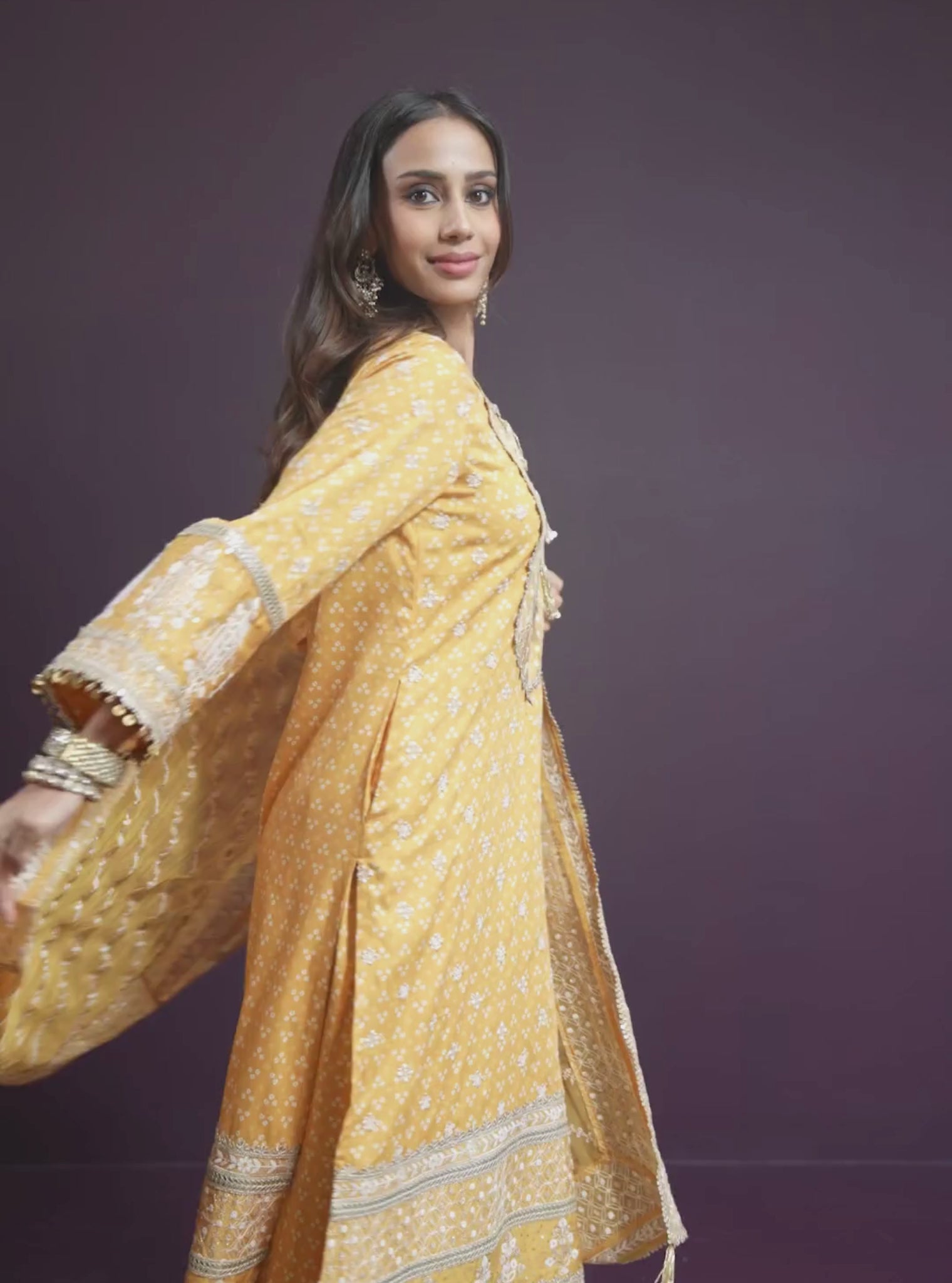 Festive warmth in a mustard printed kurta set crafted from pima satin. The straight kurta and pants are finished with a matching organza dupatta, adding lightness to the rich base.
