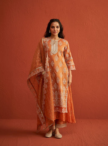Paired with a matching dupatta, the set brings a regal feel to any occasion. The dupatta features an embroidered scalloped border, and scattered booti embroidery, giving it a festive touch while maintaining a balanced and elegant appearance. The pants are designed with lace accents at the hem, providing a cohesive finish to the look.