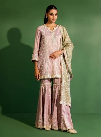 Illuminate every celebration with this opulent lilacsharara set. Crafted from lustrous fabric, the kurta and sharara are adorned with intricate gold thread embroidery, bringing a celestial charm to your ensemble. The ornate neckline and sleeves exude a regal aura, making it the perfect choice for a grand evening.
