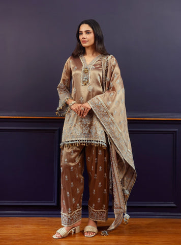 Rich and earthy, this brown kurta set in tissue fabric carries a soft sheen that feels instantly festive. The straight kurta is detailed with delicate embroidery, paired with relaxed pants and a matching tissue dupatta. A look that balances elegance and comfort.