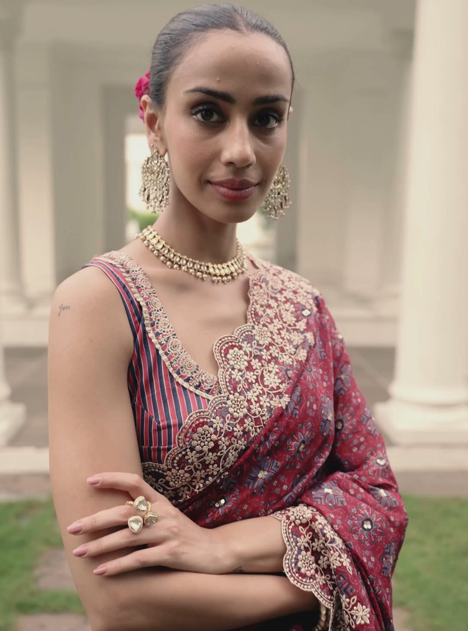 A red Ajrakh-printed organza saree with a romantic, airy drape. The saree is highlighted by an elaborate scalloped border running along the pallu and hem, giving it a couture finish. This piece blends tradition with elegant lightness.
