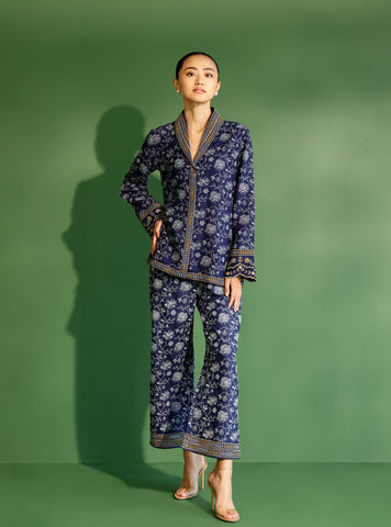 The top features a lapel with contrasting pink and black embroidery along the edges, adding a refined touch to the structured silhouette. The slightly flared cuffs echo the same embroidered detailing. The matching pants boast a wide-leg fit that flatters all body types. The hem is finished with matching pink and black embroidered borders, giving a balanced, structured finish to the overall outfit. This wool set is perfect for stepping out in style during cooler months. Whether worn to a chic brunch or an elegant evening event, this set promises comfort, warmth, and an effortlessly sophisticated look.