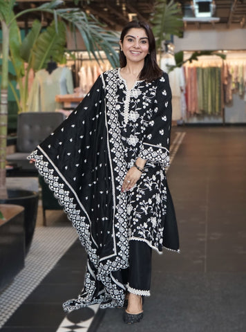 This refreshing black wool set is a delicate fusion of comfort and elegance, perfect for a sophisticated winter look. The kurta is embellished with intricate floral embroidery in a soft lavender hue. The kurta features a V-neckline framed by scalloped lace detailing in matching lavender. The sleeves are finished with an embroidered cuff and scalloped edges. The matching pants are tailored for a sleek silhouette. They are completed with scalloped lavender lace along the hem, tying the ensemble together beautifully. Finish the look with the matching embroidered dupatta.
